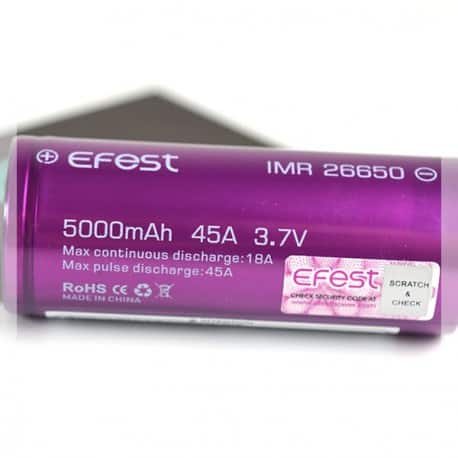 The Efest Purple 26650 5000mAh 45A is the new version of the 26650 Flat Head battery made by Efest. The Efest Purple 26650 5000mAh is a Li-Mn (Lithium-Manganese) battery which is convenient for sub-ohm use (up to 0.15 ohms). With the 5000mAh capacity and tenfold autonomy, it can have a discharge current in Pulse of 45A (18A in Continue). The Efest Purple 26650 5000mAh is perfectly convenient for the Nebula, Pico Mega, Ijoy Lux Boxes.