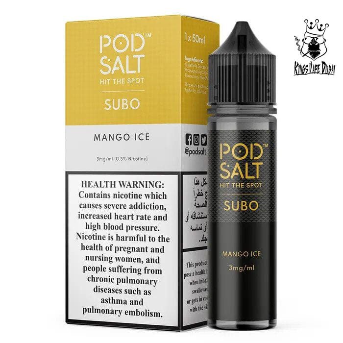 A refreshing Pod Salt Subo Mango Ice flavored nicotine salt e-liquid made for a glacial vaping experience.